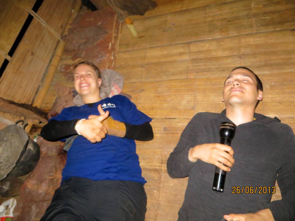 Night Hike casualty: A volunteer tries Reiki on Doc Mexico, stricken with Dengue fever.