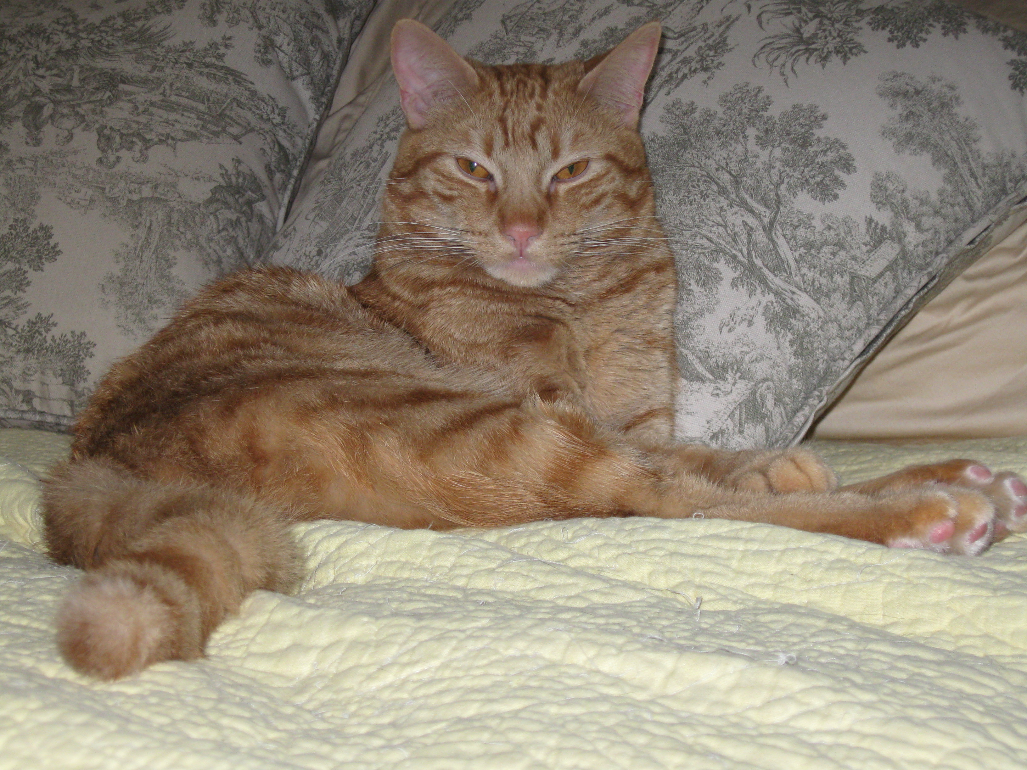 I don’t play favorites with my cats but if pushed I would have to admit that Lyle is my most stunning-looking cat, proving that my perceptions, especially the old, entrenched ones, like I am a dog person and One cat is enough and Tabby cats are ugly, are often wrong. He is powerfully built, his fur is flaming-orange and tiger-striped, he has big meaty paws and a full, leonine tail. He’s even got some space alien in him, which doesn’t quite come through in photos. He has huge almond-shaped eyes and sometimes, particularly at night, when I look over and see his eyes staring at me, I think it’s one of those anal-probing aliens, the grays, coming for me.